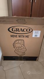 Graco Move With Me Baby, come nuova, perfettamente funzionante, poco utilizzata, con scatolo originale, trasformatore, capottina, poggiatesta e inserto per neonati. Lunghezza 69cm, larghezza 52,5cm e altezza 67,5cm. Pieghevole.