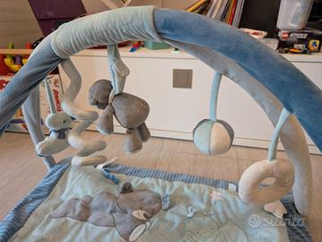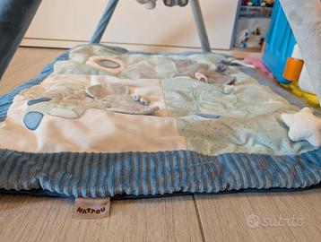 Sdraietta in tessuto Nattou, non ha parti esposte in plastica, non ha parti elettroniche, i colori sono tenui e i disegni semplici, ma ben definiti. Il tappeto ed i ciondoli sono lavabili facilmente.