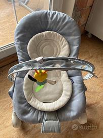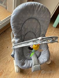 Funzioni Dondolo e Poltroncina, con Barra Gioco, Schienale Regolabile e Cuscino Riduttore, Chiusura Compatta, azzurro chiaro e disegni bianchi.