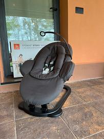 Sdraietta Stokke Steps Bouncer in colorazione grigio scuro, condizioni buonissime. La sdraietta ha una minima regolazione per modificare l’inclinazione.