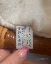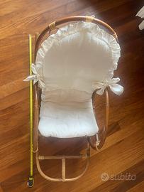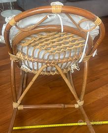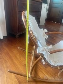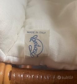 Splendida sedia a dondolo a misura di bambino della storica azienda italiana Fantasy. Non è un prodotto industriale in plastica, ma un pezzo di artigianato autentico realizzato in rattan e midollino naturale. Il design è elegante e senza tempo, perfetto per completare una cameretta in stile Boho-Chic, naturale o vintage. La sedia è molto stabile e offre un dondolio dolce e sicuro. Produttore: Fantasy (Made in Italy). Materiali: Struttura in robusto midollino e intreccio in rattan naturale. Accessori inclusi: Morbido cuscino bianco con rouches e fiocchi laterali, lavabile come da fotografia. Condizioni: Molto buone. La struttura è solida e l'intreccio è integro. Segni di usura: Fito disponibili: la parte terminale posteriore dei dondoli presenta una naturale usura dovuta allo sfregamento sul pavimento (difetto puramente estetico che non ne pregiudica l'uso) e può essere facilmente migliorato con l’uso di prodotti per il legno… Età consigliata: Dai 2 ai 7 anni circa. Nella foto mia figlia Sofia all’età di sei anni. Dimensioni indicative: Altezza: ~65 cm Larghezza: ~42 cm Profondità: ~90 cm Ideale come regalo speciale o come pezzo d'arredo iconico per servizi fotografici e camerette curate.