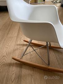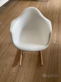 Sedia a dondolo per bambini contemporanea design scandinavo con seduta in polipropilene resistente, gambe in acciaio rinforzato e dettagli in legno massello di faggio