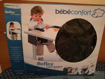 Compatta, leggera e sicura, la sedia da tavolo Reflex Lock System si fissa alla maggior parte dei tavoli grazie al sistema di blocco con dispositivo di sicurezza. Nelle foto è indicata la tipologia di tavolo compatibile. Usato poco.