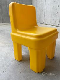 Sedie in plastica per bambini, vendibili anche singolarmente a 5 euro cadauna. La gialla è della Chicco.