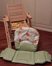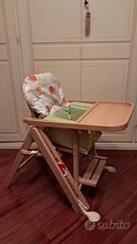 Seggiolone in legno FOPPAPEDRETTI ripiegabile ed utilizzabile su due altezze diverse regolabili anche con bambino seduto sopra. Ripiano anteriore ruotabile indietro se non necessario, altrimenti bloccabile in posizione anteriore tramite due morsettini ruotabili. Poggiapiedi ripiegabile anch'esso. Imbottitura removibile, lavabile e fissata con velcri ai braccioli. Cinturini di sicurezza per il bambino. Dimensioni: largh. x prof. x altez. - config. alta: 50x61xh95 - config. bassa: 50x78xh71,5 - config. ripiegata: 50x18xh66 Peso circa 8 kg. Vendita solo a mano. No spedizione. Difetto: 1 dei due piedini in plastica gialla incollato. Solitamante usavo il seggiolino senza entrambi i piedini ed e' stabilissimo ugualmente.