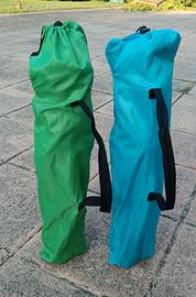 Seggioline da campeggio per bambini. Richiudibili dopo l'uso, occupano pochissimo spazio. Con vano portabicchiere e complete di sacca per il trasporto. Prezzo valido per entrambe le seggiole, comunque vendute anche singolarmente se richiesto.
