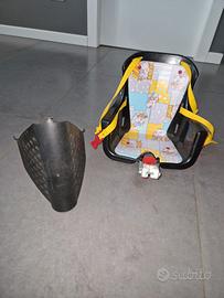 Seggiolino anteriore bicicletta, seduta e schienale imbottiti, cinghie di sicurezza. Protezione piedi per ruota anteriore inclusa