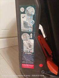Dotato di cinture bimbo a 5 punti regolabili. Fissaggio alla vettura con la cintura di sicurezza a tre punti, in dotazione al veicolo.