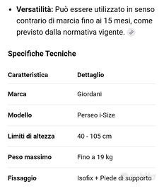 Vendo seggiolino auto Giordani Perseo I-Size (R129) ottime condizioni. Consegno igienizzato.