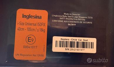 Indicativamente 0-4 anni 40-105 cm massimo 18 kg, inglesina, base roteante, tra in più sicuri, usato molto, in ottimo stato presenti segni d’usura visibili in foto come