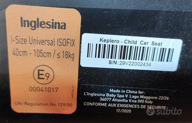 Seggiolino auto Inglesina Keplero i-Size 360° Isofix – ottimo stato Vendo seggiolino auto Inglesina Keplero i-Size (40–105 cm), omologato ECE R129 i-Size, adatto dalla nascita (40 cm) fino a circa 4 anni (105 cm). Installazione in senso contrario di marcia fino ai 15 mesi, poi anche in senso di marcia (da 76 a 105 cm). La seduta rotante a 360° consente di adagiare il bambino facilmente e cambiare direzione senza sganciare il seggiolino. Seduta ergonomica e reclinabile in 3 posizioni, per il massimo comfort. Installazione sicura e intuitiva tramite agganci Isofix e gamba di supporto. Il display LCD con indicatori luminosi e segnale acustico avvisa in caso di installazione non corretta. Caratteristiche principali: - Utilizzabile dalla nascita fino a 4 anni (40–105 cm) - Omologazione europea ECE R129 i-Size - Rotazione 360° per facile accesso e cambio direzione - Reclinabile in 3 posizioni - Cuscino riduttore fino a 5,5 kg per una postura corretta nei primi mesi - Testalino regolabile in 6 altezze - Side Head Protection per maggiore sicurezza in caso di impatto laterale - Rivestimento sfoderabile e lavabile a 30°C - Colore Navy 🔹 Ottimo stato, usato pochissimo e sempre protetto dalla luce solare 📏 Dimensioni: 44 × 56 × 64 cm ⚖️ Peso: 15,2 kg Perfetto per chi cerca comfort, sicurezza e praticità nei viaggi in auto