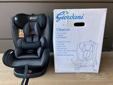 Vendo seggiolino (colore nero e grigio) auto marca Giordani Oberon gruppo I-II-III 0-36kg, installazione con ISOFIX e cintura Top-Tether; poggiatesta regolabile e seduta reclinabile in 2 posizioni, ruota a 360* per favorire ingresso e uscita del bambino dall’auto.