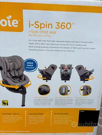 Vendo seggiolino auto JOIE I-spin 360 con base isofix omologato R129 adatto dai 0 mesi ai 4 anni 40-105 cm completo di scatola originale istruzioni e riduttore. Posizionabile in entrambi i sensi di marcia, rotazione 360° per posizionare comodamente e correttamente il bambino all’interno del seggiolino. Tenuto in ottime condizioni non incidentato, completamente sfoderabile per essere igenizzato in lavatrice. Acquistato nuovo e utilizzato sempre e solo dalla mia bambina.