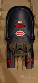 Seggiolino da bambino per bici inclinabile. Con cintura di sicurezza a 3 punti e fasce di bloccaggio piedi. Il seggiolino ha un blocco di fissaggio da montare sul piantone del sellino ed un sistema di sgancio rapido con codice tipo lucchetto.