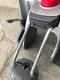 Il semplice movimento di una mano fa ruotare il pomolo di comando che alza e abbassa lo schienale, anche con il bambino seduto dentro. Simultaneamente, il seggiolino avanza o arretra per mantenere il corretto baricentro.