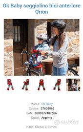 Vendo seggiolino marca BABY (prodotto italiano), come nuovo, usato solo per due uscite, facile da montare (con una chiave inglese del 10), leggero e sicuro (allaccio cinture e maniglione frontale per aggrapparsi apribile), poggia piedi regolabile con fermapiedi a scatto. Completo di blocco da installare su bicicletta. Davvero comodo!