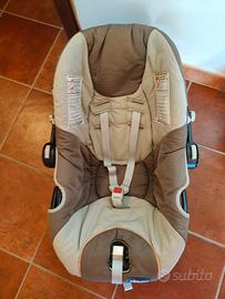 Seggiolino Chicco beige capacità fino a tredici chili. In uno dei bottoni laterali manca la placca di plastica nera.