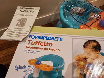 Vendo seggiolino da bagno Foppapedretti Tuffetto con sistema di sgancio, con ventose per consentire il fissaggio alla vasca da bagno. Bracciolo di protezione apribile a cancelletto, per far sedere agevolmente il bambino. Davanzalino corredato di giochi educativi multicolor e pompetta spruzza acqua. Usato in buone condizioni, completo di scatola.