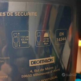 Seggiolino B-Twin per bicicletta tipo graziella da fissare al portapacchi (fissaggio semplicissimo attraverso una manopola + cinghia di sicurezza con fibbia). Cinture di sicurezza regolabili su 2 altezze (fascia età da 2 a 6 anni), poggiapiedi regolabili su 4 livelli, gancio posteriore portacasco (o buste). Per bimbi fino a 110 cm e 22 kg. Vendo con manuale istruzioni.