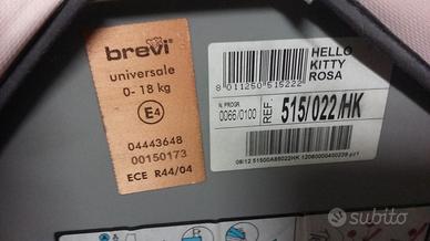 Seggiolino Hello Kitty marca Brevi, idoneo fino a 18kg 3 anni circa o anche piu. Tenuto bene usato poco . Fodera lavabile.