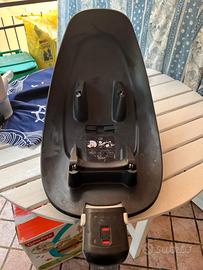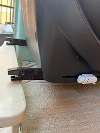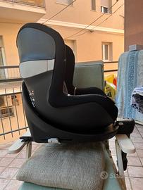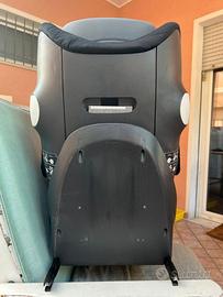 Seggiolino auto + base Isofix, dalla nascita ai 105 cm di altezza (4 anni circa), utilizzabile sia rivolto contro il senso di marcia sia nel senso di marcia. Colore grigio e nero.