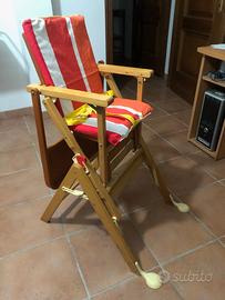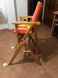 Seggiolino in legno posizionabile su due altezze, vassoio ribaltabile, schienale con inclinazione regolabile, poggiapiedi regolabile.