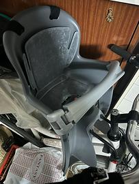 Seggiolino per bicicletta per bambini, colore grigio con contura di sicurezza e poggia piedi, tenuto in ottime condizioni