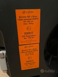 Vendo seggiolino SIRONA S2 i-SIZE della Cybex, adatto dai 3 mesi ai 4 anni (18kg). Buone condizioni. Il seggiolino é dotato di un meccanismo di rotazione a 360° con una mano per agevolare la salita a bordo e la discesa. No spedizioni, ritiro a mano zona Via della Fotografia (Roma)