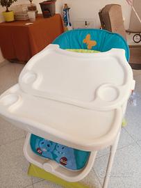 Il seggiolone ha un vassoio bianco rimovibile e un sedile imbottito, di colore verde acqua con un motivo a farfalla arancione.