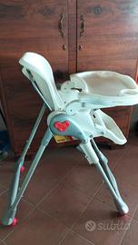 Seggiolone Brevi molto resistente. Seduta reclinabile, regolabile in altezza, plastica protettiva sul vassoio. Con cinture (presenti a parte, tolte per il lavaggio). Manca il cuscino per la seduta.