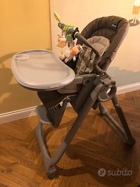 Seggiolone Chicco completo di tavolino, copri tavolino, barra dei giochini, copri sedile in plastica e riduttore in stoffa con lato estivo e invernale. Spedisco in imballo originale.