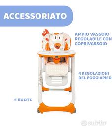 Vendo seggiolone Chicco Polly 2 start, reclinabile comprensivo di poggia piedi e con la possibilita di allargare lo schienale. È in ottime condizioni, fatto salvo per alcune scoloriture laterali dovute ai frequenti lavaggi, come si puó benissimo vedere dalle foto.