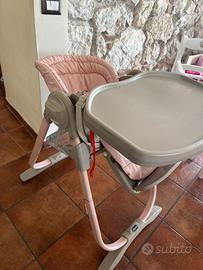 Vendo seggiolone Chicco Polly Magic Relax rosa richiudibile, reclinabile, compreso di riduttore, giochini e tavolino in plastica. Molto pratico, il tavolino si sgancia per pulirlo. Completamente sfoderabile, con cinturine regolabili. Adatto dai 6 mesi ai 3 anni. Se il bimbo si addormenta é possibile reclinare lo schienale. Usato, con segni di usura ma bello e funzionale.