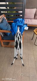 Sediolone da campeggio richiudibile con custodia. È come nuovo presenta uno strappetto riparabile (vedo foto) e una macchiolina (un puntino, vedi foto) . Presenza di alluminio leggermente ossidato e due viti piccole che si sono arrugginite perché tenuto in garage. Per il resto è tranquillamente utilizzabile l. Io lho utilizzato solo qualche giorno perché mia figlia non ci voleva stare.