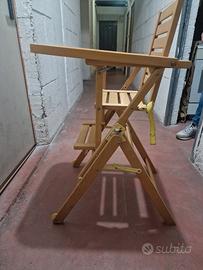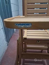 L'inimitabile seggiolone Foppapedretti in legno, con ampio vassoio ribaltabile, schienale regolabile e poggia piedi retraibile. si chiude completamente per un facile trasporto. Usato ma in ottime condizioni perché ha una struttura solida e durevole nel tempo. Manca la cintura con l'aggancio spartigambe.