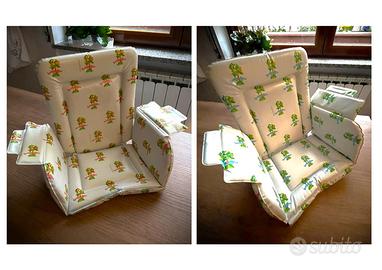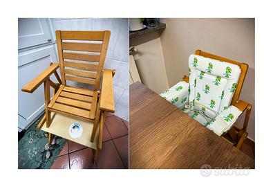 Seggiolone in legno stabile, robusto e molto versatile, utilizzato con grande cura. È completo di cuscinetto double‑face, pulito e ben imbottito, ideale per garantire comfort e praticità.