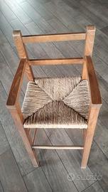 Seggiolone in legno e paglia vintage. In buonissimo stato Altezza 88 cm Larghezza e profondità 30x40 cm.