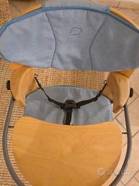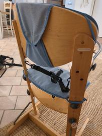 seggiolone usato ma ancora robusto, essendo in legno. nella terza foto si vede una parte scollata, basta rimettere la colla perché la base di appoggio è solida. una clip della cintura ha un dente in meno, basta sostituirla o comunque funziona.