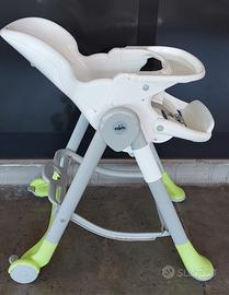 6 altezze, 3 inclinazioni dello schienale, 2 tavolette regolabili e removibili, cinghia 5 punti, ruote posteriori con freno. Super compatto, aperto L62 P84 H109, chiuso L62 P44 H96.