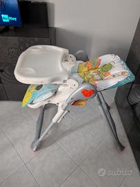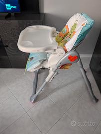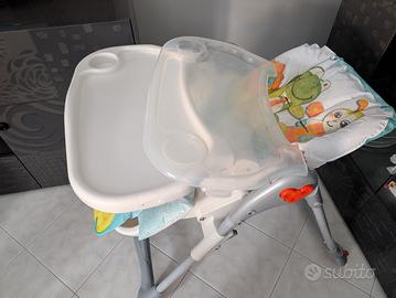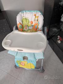 seggiolone pappa con schienale reclinabile e vassoio estraibile per poterlo pulire a fondo. anche l'imbottitura si toglie facilmente per riuscire a pulirlo completamente. regolabile in altezza.