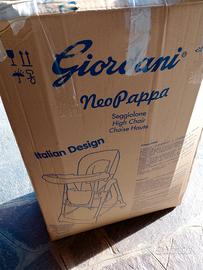seggiolone pappa giordani, telaio bianco e rosso completo di cinghie e portaoggetti, la seduta presenta piccolo taglio