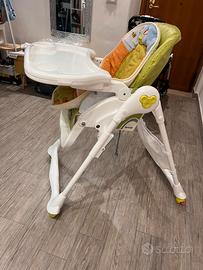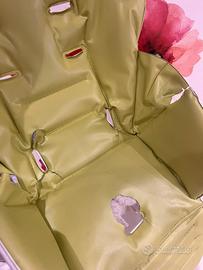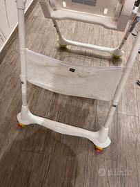 Sedile reclinabile e poggiapiedi regolabile, con arco giochi e riduttore per i piu piccoli, cinghie di protezione, vassoio per la pappa con copertura, retina portaoggetti