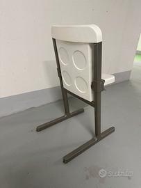 La seduta multiposizione del seggiolone è regolabile in altezza (da 46 a 75,5 cm) e il poggiapiedi è regolabile in 21 posizioni. Slex Evo si trasforma da seggiolone in pratica sedia adatta per ogni età, per i momenti di studio o relax o in sgabello alto (fino a 75,5 cm). In dotazione: rail di sicurezza rimovibile, tavolino, seduta morbida in cotone.