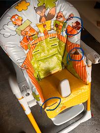 Seggiolone dotato di seduta regolabile in 7 altezze, schienale reclinabile e poggiapiedi regolabile per il massimo comfort. Seggiolino anatomico imbottito. Schienale reclinabile, molto utile quando si addormentano dopo pranzo. Nota bene, mancano le cinture. Le 4 ruote con freno permettono di spostarlo facilmente in tutta la casa. Include doppio vassoio removibile con porta bicchiere e rivestimento in PVC lavabile. L’imbottitura presenta piccoli strappi e normali segni del tempo (visibili nelle foto cerchiate in blu), ma il seggiolone è perfettamente funzionante e svolge egregiamente il suo utilizzo. Nota: le cinture di sicurezza non sono presenti.