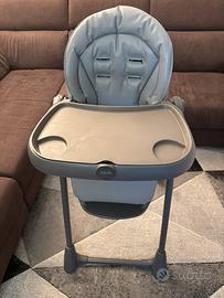 Seggiolone usato marca CAM modello PAPPANANNA ICON colore grigio con cinture di sicurezza, vassoio e ripiano d’appoggio ed altezza regolabile.