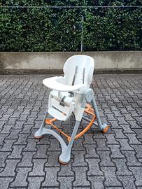 Con doppio vassoio: grande e piccolo; staccabili per comodità di pulizia. Inclinabile fino a mettere i bimbi praticamente sdraiati, con blocco in mezzo alle gambe per i più piccoli.