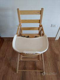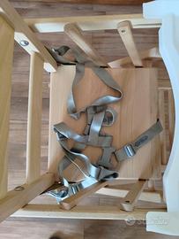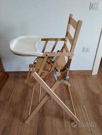 Il seggiolone è in legno di faggio massello, è dotato di cinture di sicurezza su 5 punti ed ha un comodo vassoio rimovibile in PVC.