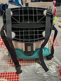 Seggiolone Idea Cam portatile. Presenta una piccola macchia sul rivestimento, nonostante il lavaggio e la sanificazione in lavatrice. Cinghia alla base per l'ancoraggio alla sedia non originale, sostituita con una di pari lunghezza.