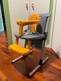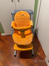 Seggiolone Brevi Flex. La seduta é regolabile in altezza grazie a due semplici pulsanti che consentono di alzarla o abbassarla a piacimento. Tutti gli accessori si possono togliere per trasformare il seggiolone in una comoda sedia. É completo di cinghie e imbottiture. Colore grigio e arancione.