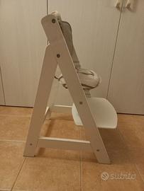 Seggiolone/sedia in legno, con sedile e poggiapiedi regolabili in altezza, barra di sicurezza montabile opzionalmente (visibile nella prima foto), cinghie a 3 punti, cuscini per la seduta e lo schienale. Gli elementi di sicurezza sono removibili, per adattare la sedia alla crescita del bambino fino a 6 anni / 50Kg.